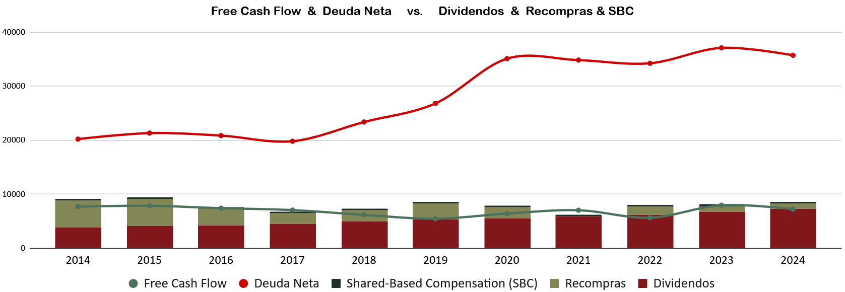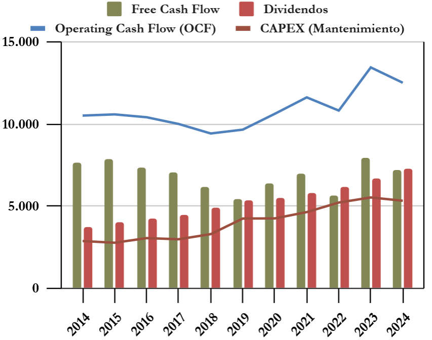 PepsiCo es una empresa con un negocio excelente y predecible, características que valoramos mucho. Sin embargo, en la última década, la remuneración a los accionistas ha superado el flujo de caja libre (FCF) generado por la empresa, lo cual es insostenible a largo plazo.