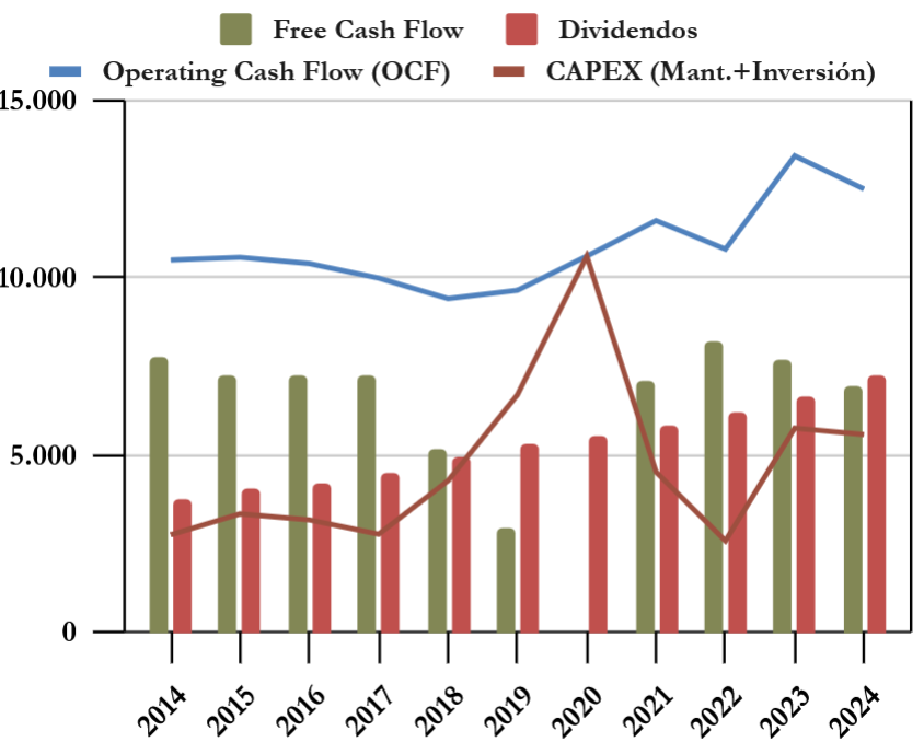Sin embargo, el CAPEX de mantenimiento ha crecido más que el OCF. En 2019, el CAPEX se elevó impulsado principalmente por dos factores: una necesaria digitalización y la modernización de la producción para eliminar los cuellos de botella en la cadena de suministro. Esto ha llevado a un nivel elevado de CAPEX en los últimos años.