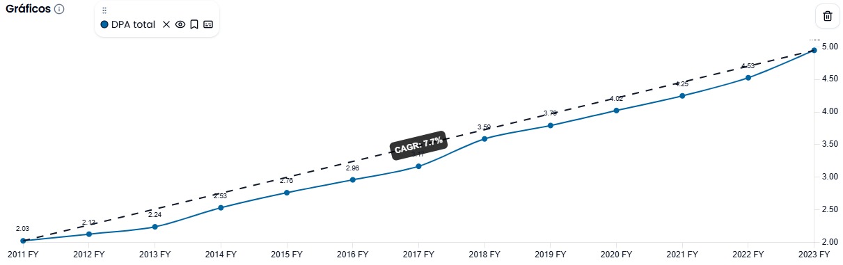 El DPA ha aumentado más que el BPA, con un crecimiento medio anual del 7,92%. Este es un dato excepcional, especialmente para un Dividend King. Sin embargo, la Rentabilidad por Dividendo (RPD) inicial ha sido bastante baja.