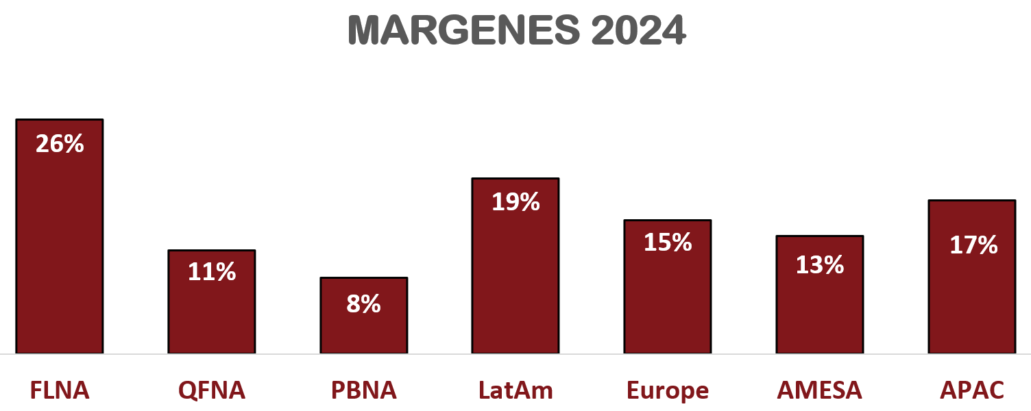 En 2024, los ingresos de PepsiCo en Norteamérica experimentaron una caída global del -0,79%. Frito-Lay North America (FLNA) tuvo una ligera disminución del -0,64%, reflejando un retroceso en el negocio de snacks en Estados Unidos y Canadá. Quaker Foods North America (QFNA) sufrió una caída considerable del -13,71%, principalmente debido a los retiros de productos relacionados con la posible contaminación por Salmonella, lo que afectó negativamente las ventas de barras y cereales. Por otro lado, PepsiCo Beverages North America (PBNA) logró mantenerse, aunque con un crecimiento muy pequeño del 0,52%.