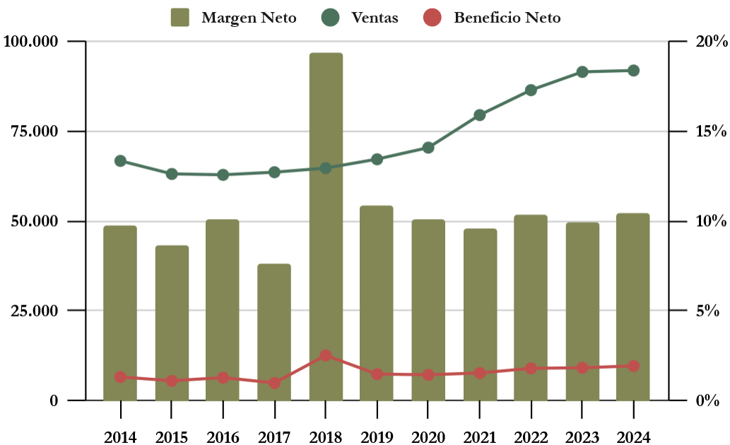 A pesar de que las Ventas se mantuvieron planas en 2024, el Beneficio Neto de PepsiCo aumentó un 5,6%. Los márgenes de PepsiCo son considerablemente altos y estables, situándose en torno a un Margen Neto del 10% y un Margen Operativo del 14%. Sin embargo, estos márgenes son inferiores a los de sus principales competidores: Coca-Cola obtuvo en 2024 un Margen Neto del 23%, mientras que el de Mondelez se elevó al 13%.