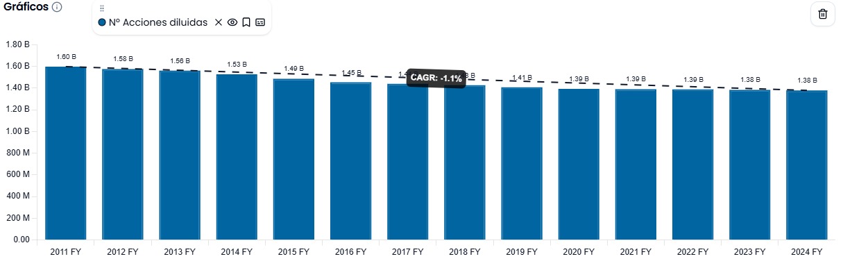 Aunque la principal estrategia de PepsiCo es priorizar el pago de dividendos, también ha reducido significativamente su número de acciones en circulación en los últimos años. Esta reducción ha sido a un ritmo anualizado del -1,02%, lo que equivale a un 10% menos de acciones en circulación durante el período de 2014 a 2025.