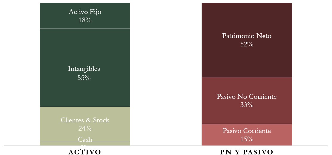 Para los que hayais leído nuestro artículo sobre Diageo, a primera vista el Balance de estas dos empresas del sector de bebidas alcohólicas es bastante similar: Intangibles muy altos y superiores al Patrimonio Neto, relación de corrientes holgada y poca tesorería. Vayamos punto por punto.