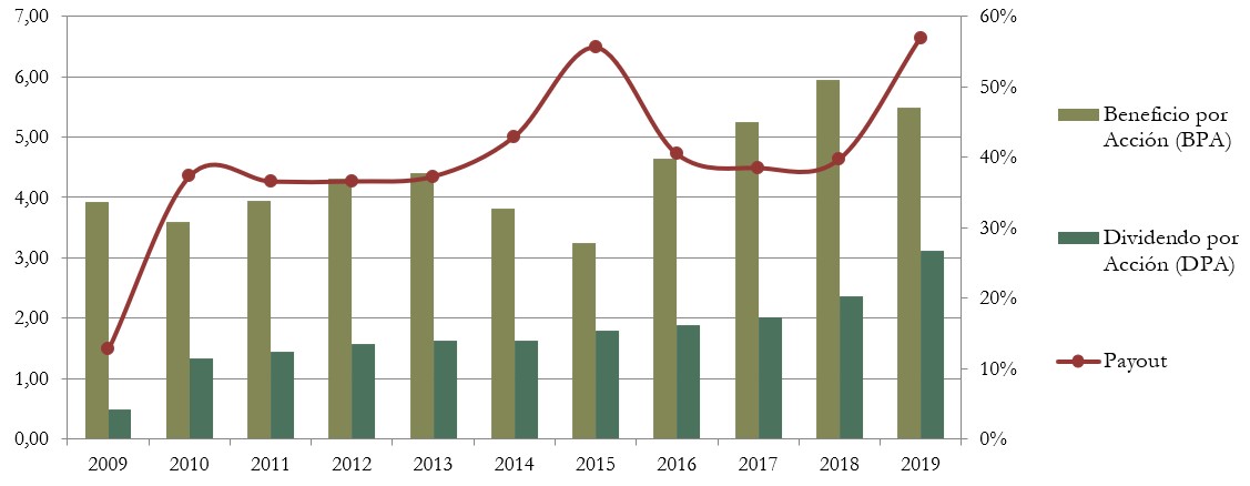 Pernod Ricard ha distribuido un dividendo creciente durante los últimos diez años, pese a que el BPA no haya crecido de manera regular. En particular, el Dividendo ha tenido crecimientos de dos dígitos durante los últimos dos años (+17% en 2018 y +32% en 2019). Este crecimiento parece ser debido a la voluntad de Pernod Ricard de fijar un Payout del 50% a partir de 2019, mientras oscilaba alrededor del 40% los años anteriores.