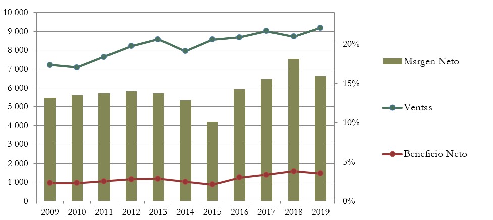 Las Ventas han aumentado un 2,5% anual durante los últimos diez años. No es un incremento impresionante, pero la tendencia es positiva y constante.