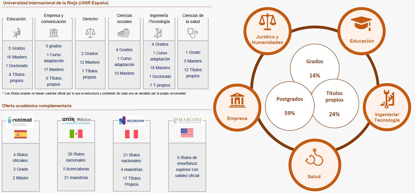 En 2012, creó la filial UNIR México y en apenas un año consiguió la aprobación para impartir cursos a distancia y otorgar títulos oficiales en el país. Siguieron Colombia (2015), Perú (2016) y Ecuador (2017), países que también reconocieron algunas de las titulaciones de la UNIR y desde donde también da desde entonces soporte a todas las empresas del grupo en cuanto a tareas administrativas.