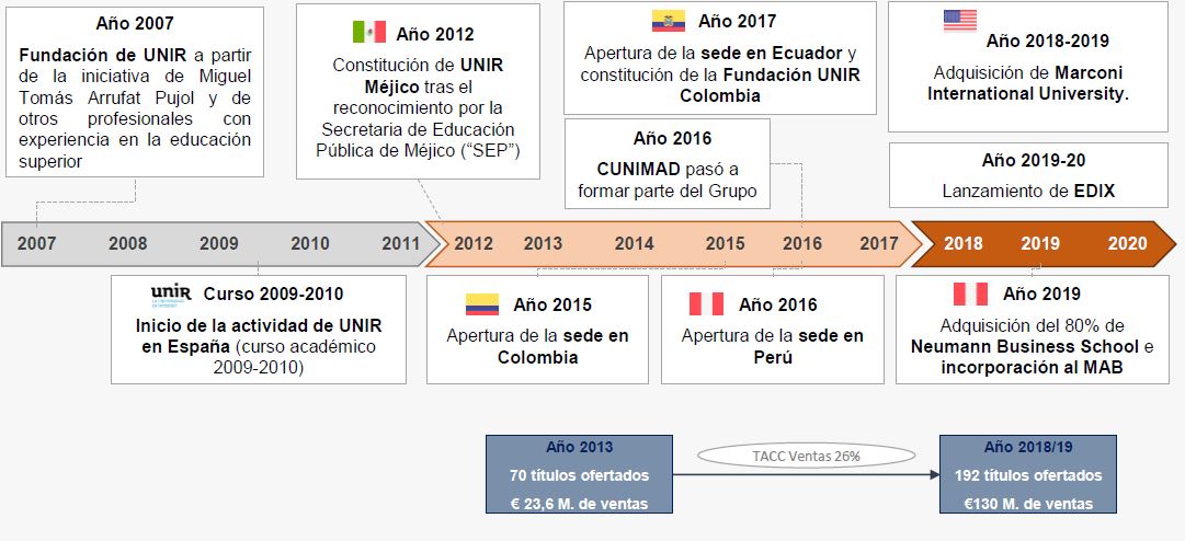 La empresa se creó en 2007, de la mano del empresario catalán Miguel Tomás Arrufat Pujol. Al año siguiente, la principal escuela del grupo (UNIR) consiguió que el Parlamento de La Rioja le autorizase a impartir clases y emitir títulos académicos universitarios de carácter oficial. Y en 2009 empezó su actividad con sus 4 primeras facultades: Ciencias Jurídicas y Humanidades, Empresa, Educación e Ingeniería y Salud.