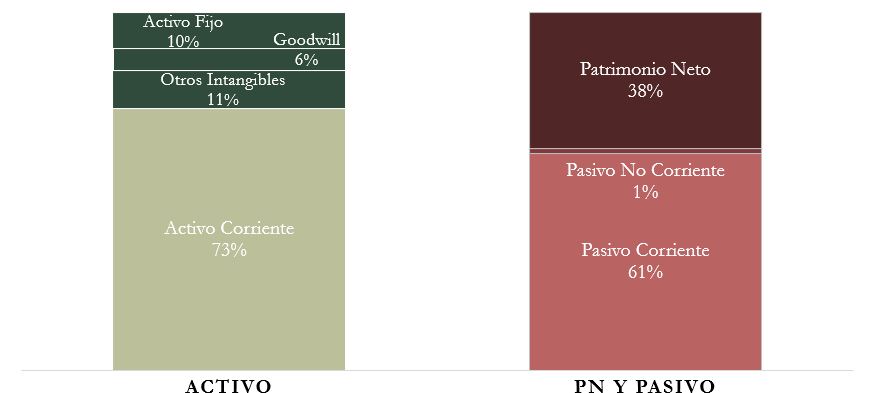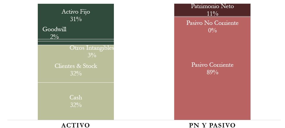 Tenemos que tener en cuenta que Proeduca Altus finaliza su año fiscal a 31 de agosto, para reflejar lo mejor posible las Ventas a lo largo de un curso escolar. Sin embargo, para esa fecha ya ha cobrado por adelantado buena parte de los cursos que va a impartir durante el verano y al año siguiente. Estos cursos todavía no se han dado, pero la empresa ya ha realizado el cobro, con lo que veremos mucho Cash en la parte de Activos que tienen que compensarse en la parte de Pasivos. Por ello existe una partida en el Pasivo Corriente llamada “Periodificaciones a Corto Plazo” que trata precisamente de eso: compensar el dinero que Proeduca Altus tiene en caja dado que todavía no ha realizado la prestación del servicio por el que ya ha cobrado. Por ello es interesante hacer un ejercicio de obviar esta partida tanto en el Activo como en el Pasivo. Si eliminamos la partida “Periodificaciones a Corto Plazo” del pasivo y el mismo importe del Activo, nos encontramos con que el Balance se nos queda de la siguiente forma: