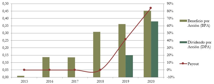 El Beneficio por Acción es muy creciente, a una media de alrededor del 35% anual en los últimos 4 ejercicios. Este ritmo de crecimiento del BPA nos hace pensar que es normal que cotice a PER bastante altos, dado el crecimiento potencial de su Beneficio Neto. Será interesante ver cómo ha afectado la crisis sanitaria al año escolar actual, pero vemos que incluso antes de los confinamientos, la educación a distancia ofrecida por Proeduca Altus tenía tasas de crecimiento muy altas.
