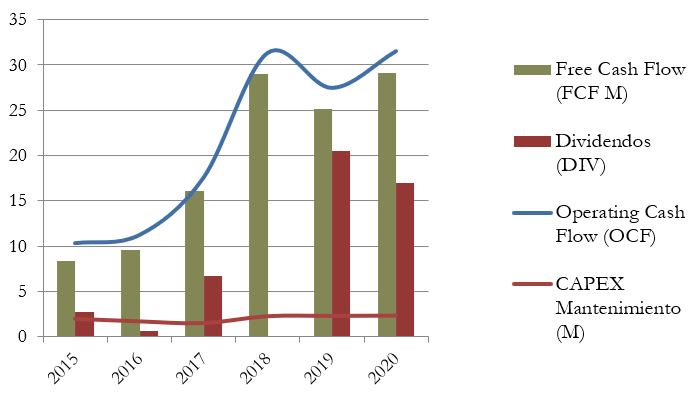Lo primero que llama la atención en el Estado de Flujos de Caja de Proeduca Altus es que el CAPEX de Mantenimiento es muy reducido y que el Operating Cash Flow es muy alto y creciente. Este gráfico nos confirma que la empresa es muy poco intensiva en capital y que es una gran generadora de caja.