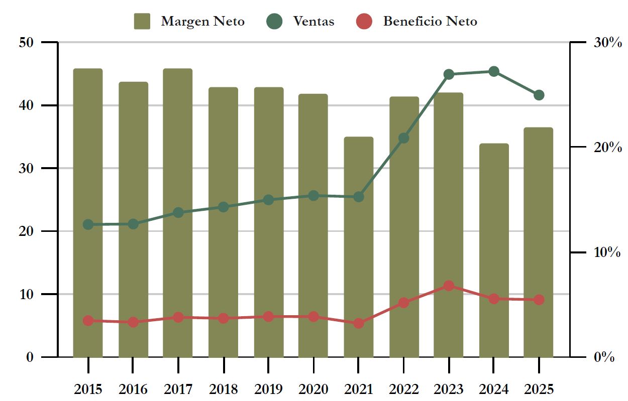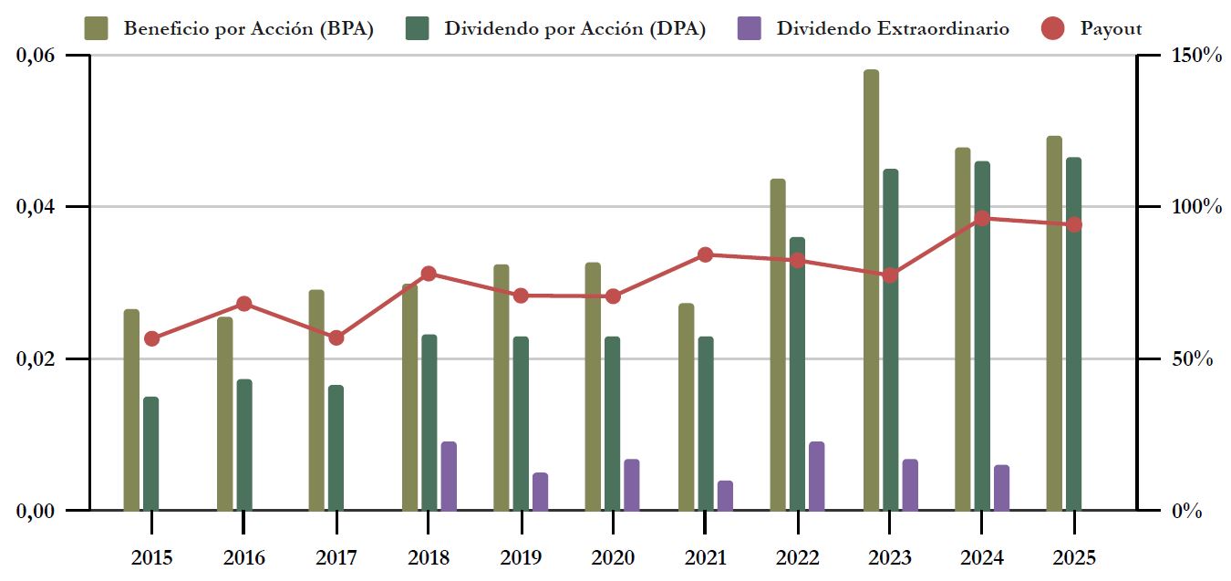 Por ejemplo, aunque el Dividendo total de 2025 sea inferior al de 2024, esto se debe a que en 2025 la compañía ha decidido no repartir un Dividendo Extraordinario, aumentando únicamente el Dividendo Ordinario en un +1,1%. Se percibe por tanto una cierta prudencia de la compañía ante los retos que tiene por delante, dado que llevaba repartiendo Dividendos Extraordinarios desde 2018 ininterrumpidamente.