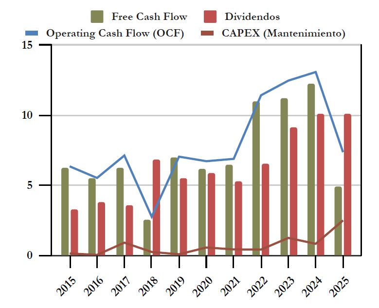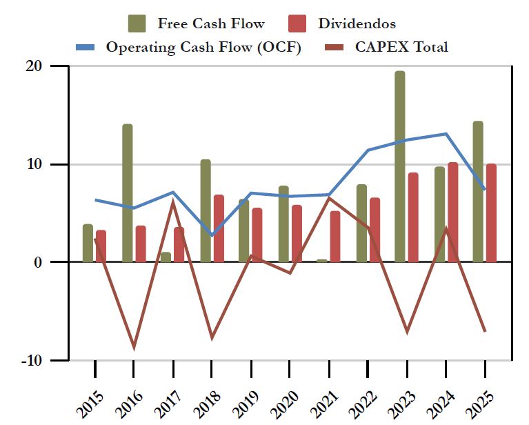 El Operating Cash Flow de Record se ha más que duplicado durante la última década, entre 2015 y 2024. Pero es notorio que este último año se ha reducido drásticamente. Esto se debe a varias razones. Por una parte, ya hemos visto que el Beneficio Neto ha sido algo menor que el año anterior (-1,6%). También en 2024 se reflejaron unos deterioros, que ya no ha habido este año 2025. Pero, sobre todo, la mayor parte de la diferencia se debe a un ajuste impositivo. Por lo tanto, esta caída del OCF no debe alarmarnos demasiado.