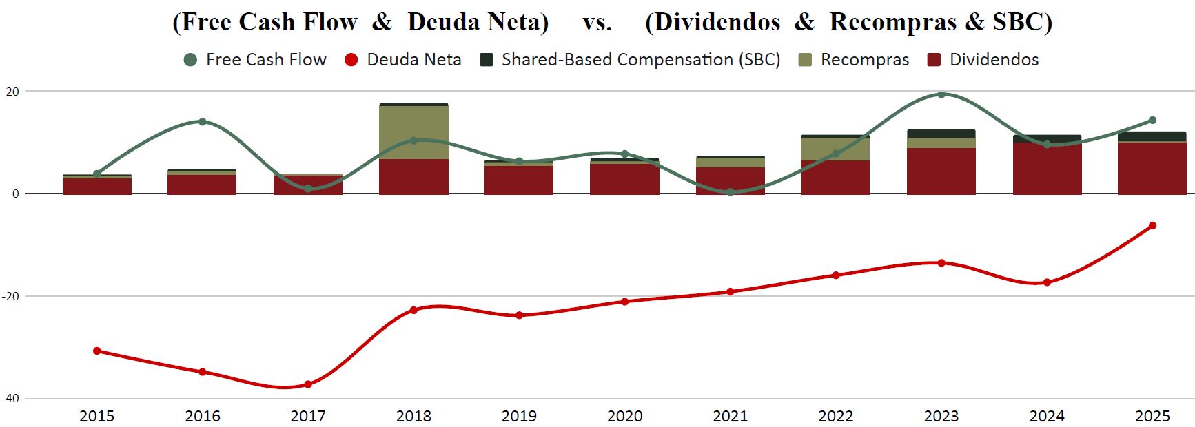 Cabe destacar, que la empresa entrega un Dividendo Ordinario, que es relativamente creciente con el tiempo, y después un Dividendo Extraordinario que varía de ejercicio a ejercicio, y que consiste en el excedente de caja de la empresa (barra morada en el gráfico).