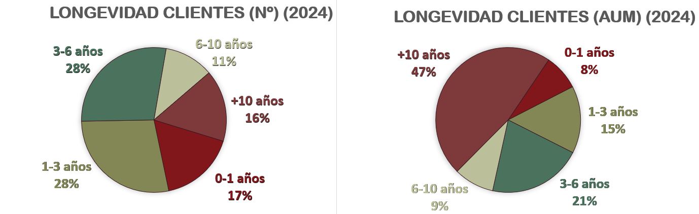 Si nos fijamos en la longevidad de los clientes, es sorprendente ver que la mayoría son relativamente recientes. Retomando la presentación anual de 2024, dado que en 2025 Record no ha reportado estos datos, apenas el 16% de los clientes tienen una antigüedad superior a 10 años. Sin embargo, si contamos esta estadística en términos de Activos Bajo Gestión (AUM), casi la mitad (47%) llevan bajo gestión de Record más de una década.