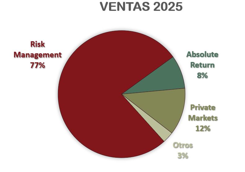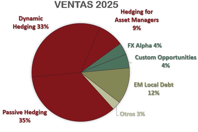 El objetivo principal del «Currency Overlay» es mitigar el riesgo de tipo de cambio al que están expuestas las carteras internacionales, y en algunos casos, generar un retorno adicional (comúnmente llamado “Alpha”) a partir de los movimientos de las divisas. El gestor de “Currency Overlay” utiliza instrumentos financieros como “forwards”, opciones y futuros de divisas para «superponer» una capa de gestión de divisas sobre la cartera de activos existente. Esto permite al inversor mantener sus inversiones internacionales mientras el gestor de overlay se encarga de protegerlos de movimientos cambiarios adversos o de aprovechar los favorables, sin interferir en las decisiones de inversión de los activos principales. Esta “capa superpuesta” de inversión puede ser “pasiva” (buscando una cobertura casi total para eliminar el riesgo de divisa) o “activa” (donde el gestor intenta predecir y beneficiarse de los movimientos de las divisas). Veremos con más detenimiento esto cuando veamos los distintos segmentos de la compañía.