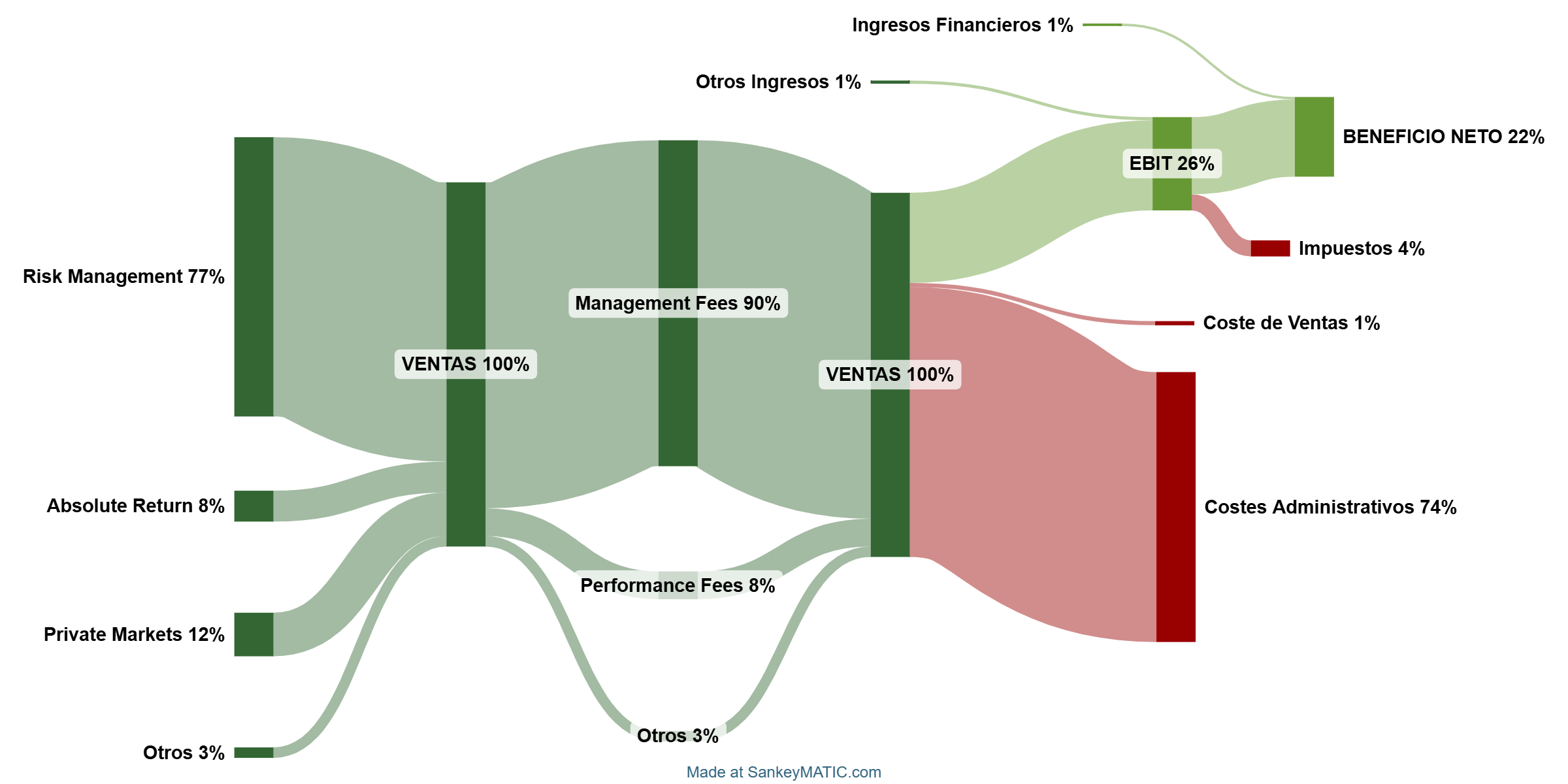 Como veíamos en la introducción, las Ventas suelen seguir la tendencia de los AUM, lo cual es lógico, dado que Record cobra por volumen de gestión. Sin embargo, hay que tener en cuenta dos variables. Por una parte, Record cobra distintas comisiones en cada uno de sus segmentos, según la dificultad de gestión y potencial retorno para sus clientes. Y, por otra parte, Record cobra una comisión fija y recurrente por gestión (Management Fees), y después unos bonus en forma de comisiones de éxito (Performance Fees).