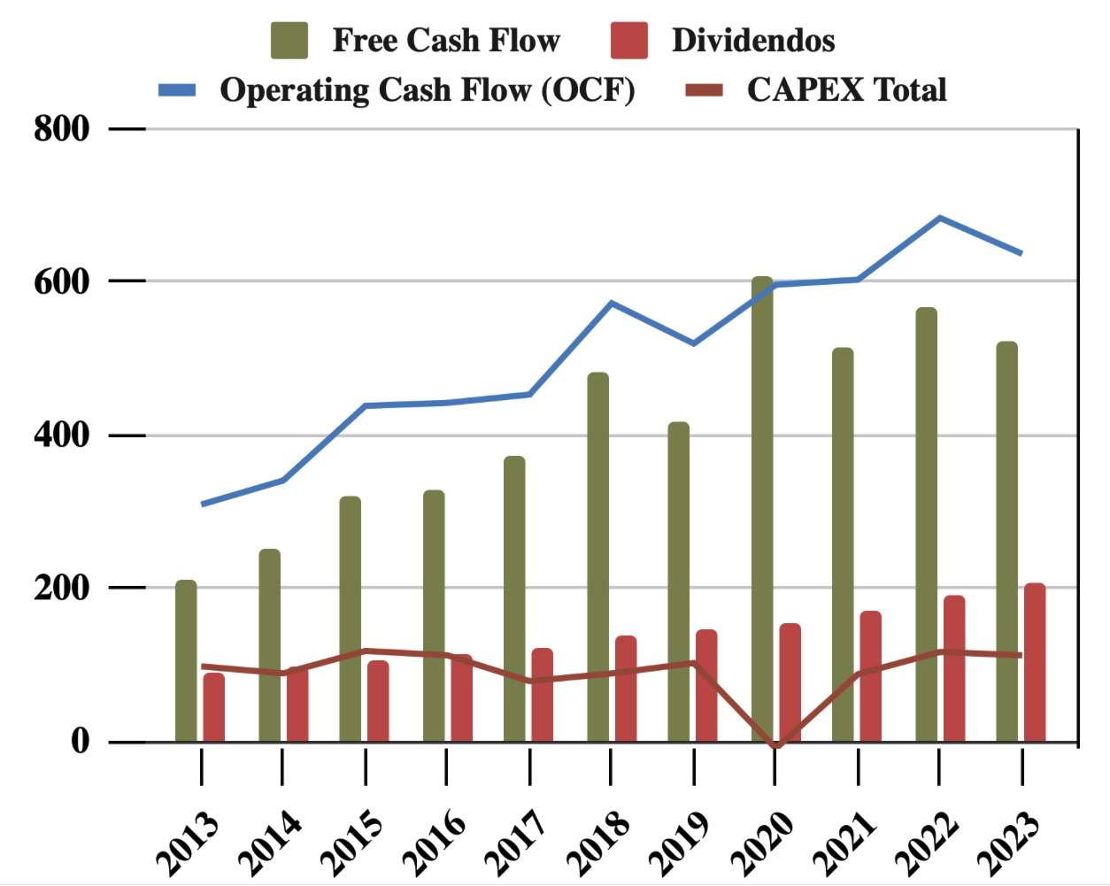 Esto ha permitido que el Flujo de Caja Libre (FCF) sea cada vez más holgado, facilitando el pago de dividendos. Es destacable que, a pesar de que el beneficio neto ha caído un 38%, el OCF solo ha disminuido un 6,85%. Esta diferencia se debe principalmente a ajustes en el Working Capital. Sin embargo, se prevé una caída más pronunciada del OCF en 2024. Aun así, la empresa no tiene deuda, y el FCF ha sido históricamente holgado, lo que mitiga la preocupación.