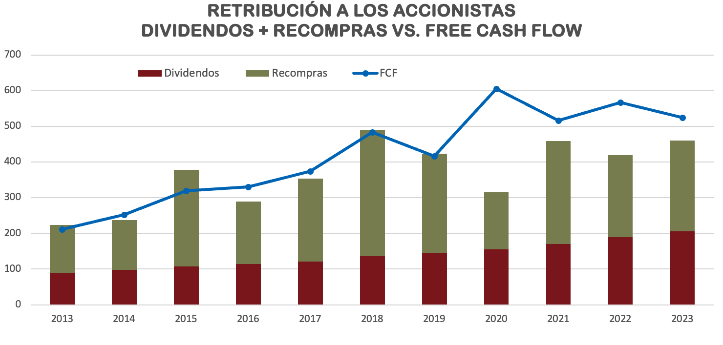 Para 2024, con un precio de las acciones significativamente más bajo, se ha aprobado la recompra de hasta 9,1 millones de acciones. Hasta ahora, la compañía ha recomprado 1,66 millones a un precio medio de $73, y se espera que continúe con las recompras durante el resto del año, superando el volumen del año anterior. Esto es una señal positiva de que la empresa confía en su negocio y busca capitalizar la baja en el precio de sus acciones.