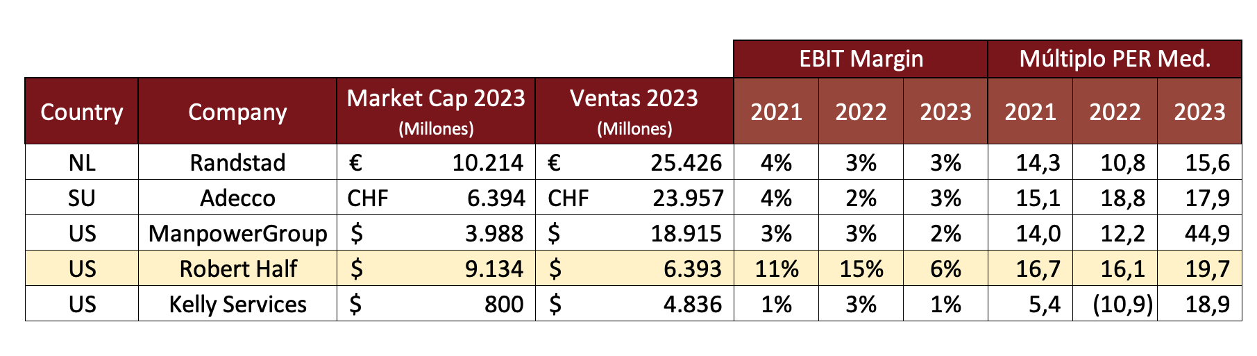 Aunque los márgenes de Robert Half no son especialmente altos, superan a los de sus competidores en la industria, lo que justifica sus múltiplos de valoración generalmente más elevados. A pesar de generar ingresos significativamente menores que otros gigantes de la industria, como Adecco y Manpower, Robert Half tiene una capitalización de mercado superior a la de estos competidores, es decir, que cotiza a múltiplos más exigentes.