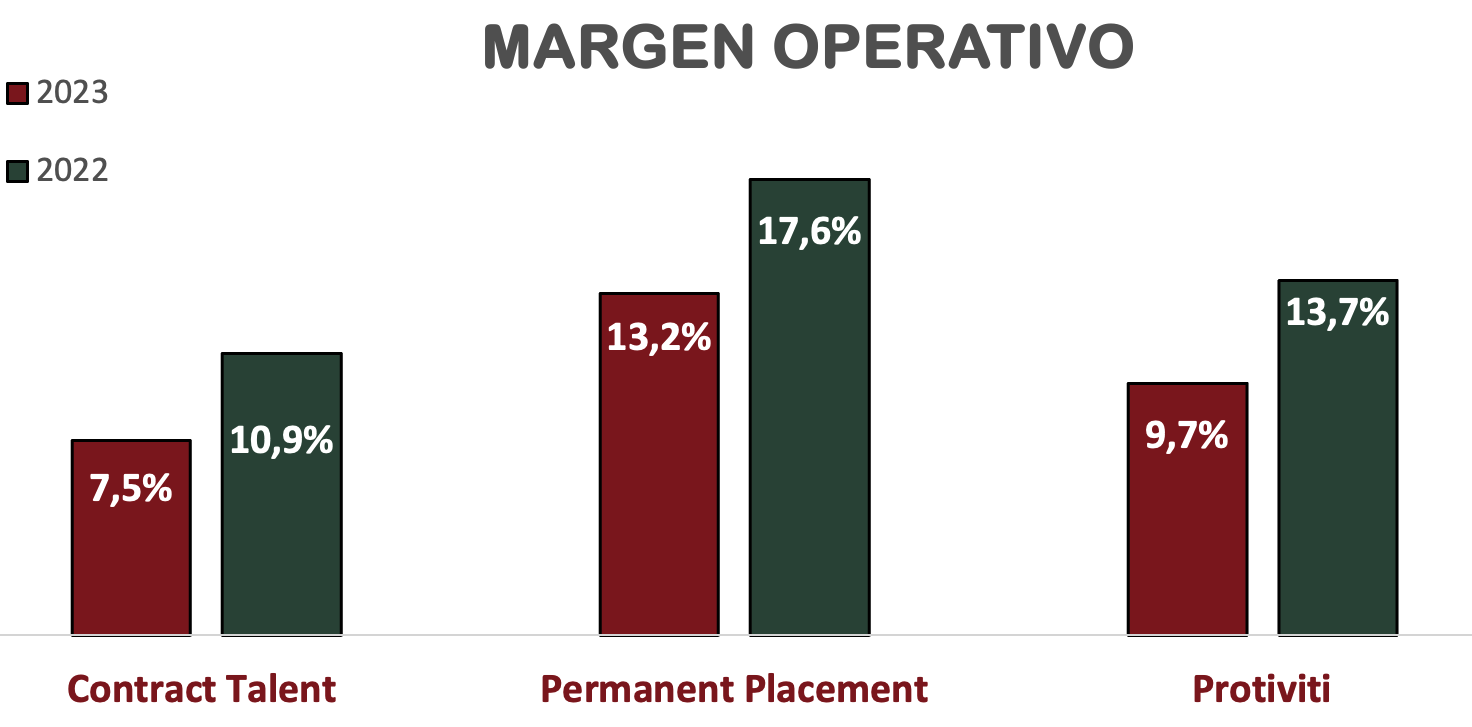 En 2024, la caída en las ventas parece que seguirá prolongándose. Hasta el segundo trimestre, la situación es todavía más alarmante, y los ingresos de Talent Solutions han disminuido un -12,2% en comparación con 2023, con caídas del -15,6% en Contract Talent y del -16,7% en Permanent Placement. Por su parte, Protiviti ha visto una reducción en ventas del -3,5%.