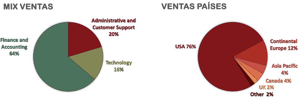 Si analizamos con más detalle la distribución geográfica de los ingresos, Europa destaca como el mercado internacional más importante, con una significativa presencia en Alemania y Bélgica, que en conjunto representan el 10% de las ventas globales. Y, por otro lado es crucial subrayar que, a pesar de su diversificación en diferentes áreas, el área de Finanzas sigue siendo el núcleo del negocio.