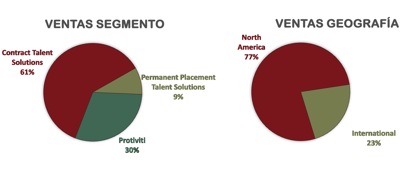 - Protiviti (Consultoría Empresarial): Representa aproximadamente el 30% de los ingresos. Protiviti es un socio estratégico para empresas que buscan mejorar su capacidad de adaptación, cumplir con normativas, optimizar procesos y gestionar riesgos de manera efectiva. Ofrece una amplia gama de servicios de consultoría, enfocándose en auditoría interna, gestión de riesgos, ciberseguridad, tecnología, finanzas, compliance y otras áreas clave.