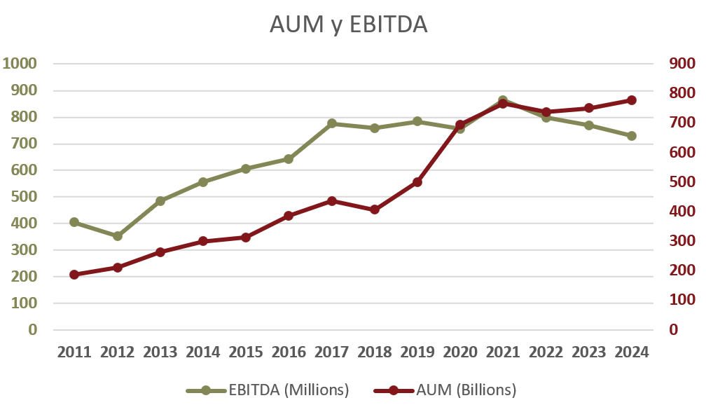 Para ello veamos la correlación entre los AUM y el EBITDA, que ya tiene en cuenta tanto los ingresos como los costes operativos de la compañía: