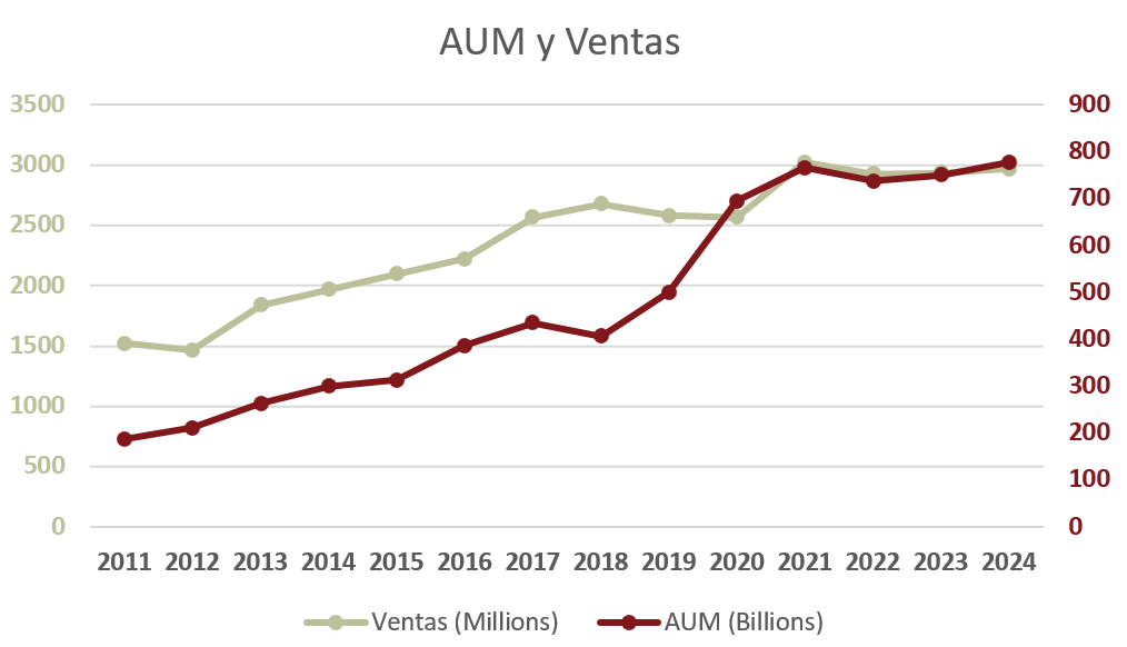 Por último, cabe también comentar que en el sector de las gestoras de activos la escala importa, y mucho, en los márgenes operativos. Esto se debe a que la estructura de costes de estas empresas no aumenta proporcionalmente con los AUM. Es decir, una vez se desarrolla la tecnología necesaria, se contrata a personal cualificado, se establecen protocolos y departamentos para el cumplimiento normativo y se dispone de una adecuada estrategia de marketing, no importa si aumentan mucho los activos bajo gestión. Aunque aumenten mucho, la estructura de costes fijos aumentará poco. Por ello veíamos en la tabla anterior que las mayores gestoras del mundo casi siempre consiguen mejores márgenes que la competencia, como es el caso de Blackrock, la mayor gestora de activos del mundo.