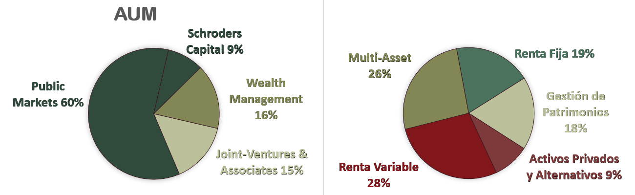 Es importante explicar que a las gestoras de activos se les suele medir por sus Activos Bajo Gestión (AUM, Assets Under Management). Estas empresas ingresan dinero principalmente por comisiones que van en función de la cantidad de estos AUM. Sin embargo, estas comisiones no son iguales para todos los AUM, y por ello la compañía quiere concentrarse en crecer en los segmentos en los que pueden cobrar más comisiones por AUM, como el capital privado (Schroders Capital) y la gestión de patrimonio (Wealth Management).
