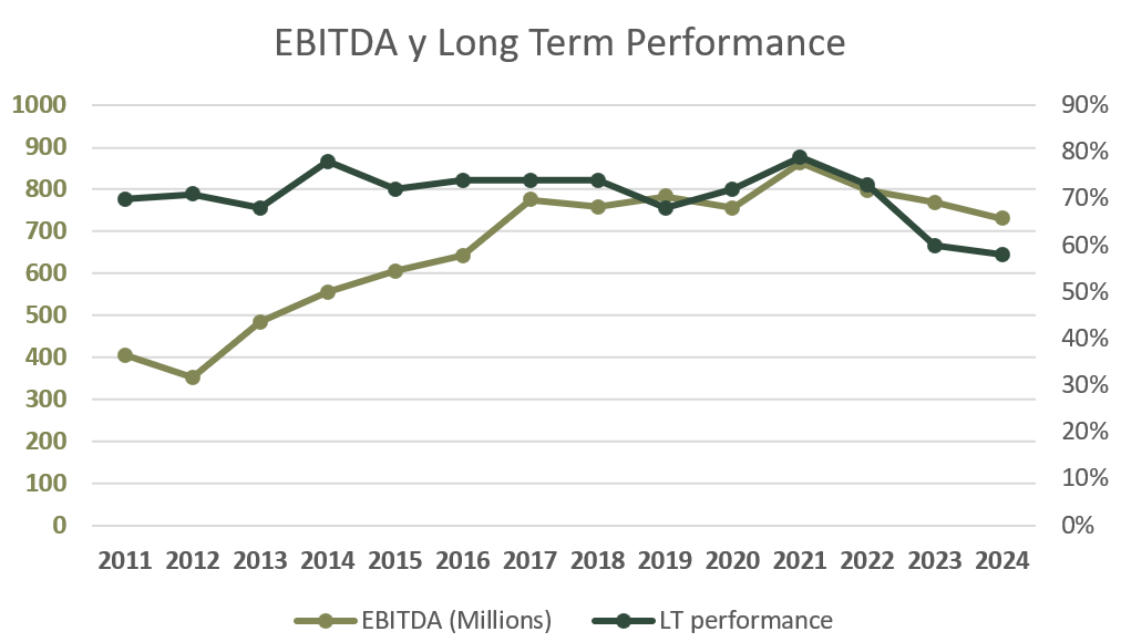 Pero existe otro problema adicional. Una razón muy importante por la que Schroders puede cobrar más comisión por sus AUM es por su reputación de conseguir mejores retornos que el mercado. Para ello Schroders lleva años marcándose como objetivo que sus AUM tengan mejor rendimiento que sus comparables gestionados por otras gestoras en al menos un 60% en un lapso de 3 años. Como podemos apreciar a continuación, estos últimos años este parámetro se ha reducido hasta no lograr su objetivo en 2023 y 2024, y esto también puede explicar una disminución de las tarifas que Schroders puede cobrar a sus clientes y por tanto una pérdida de rentabilidad. Es muy notorio observar en el siguiente gráfico que el EBITDA sólo crece mientras este ratio (Long Term Performance) se mantiene alto, pero que en cuanto baja, también lo hace el EBITDA: