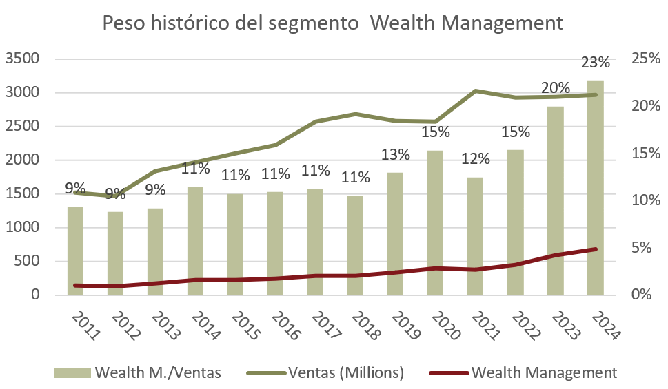 La buena noticia, es que la facturación del segmento Wealth Management ha pasado de significar un 9% de la facturación en 2011 hasta un 23% en 2025. Además, con una tendencia creciente casi ininterrumpida.