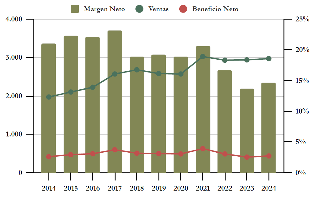 El Margen Neto de Schroders ha ido reduciéndose a lo largo de la última década, desde un excelente 21% en 2011 hasta un 15% en 2024. En cuanto al Margen Operativo, ha pasado de un 26% en 2011 hasta un 22% en 2024.