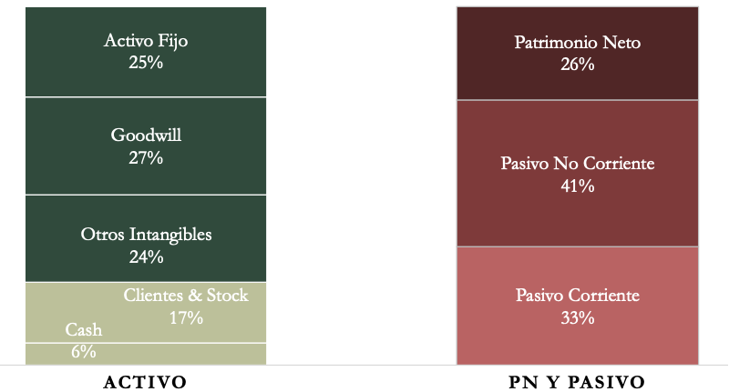 El Balance no presenta una estructura sólida: la relación de corrientes es negativa, y los Intangibles representan más de la mitad del total de los Activos.