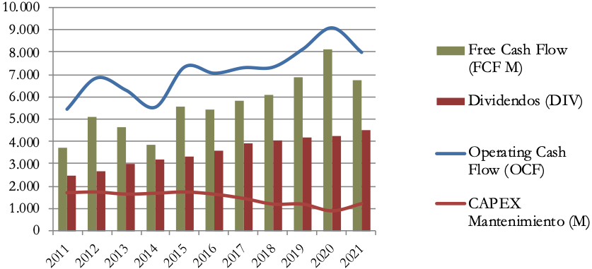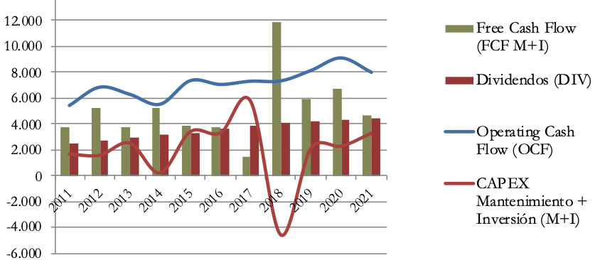Con todo, el gráfico de Free Cash Flow confirma la sostenibilidad del dividendo. Exceptuando 2017 el FCF del ejercicio es suficiente para el pago de dividendos todos los años.