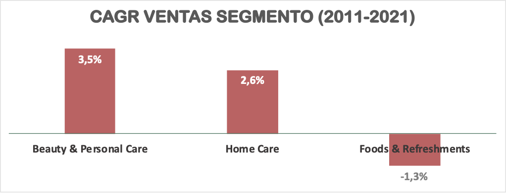 Las Ventas permanecen planas durante la última década, y presentan un modesto crecimiento del 1,22% anualizado. El segmento que más ha crecido es el de Beauty & Personal Care, mientras que Foods and Refreshments está perdiendo peso de forma continuada.