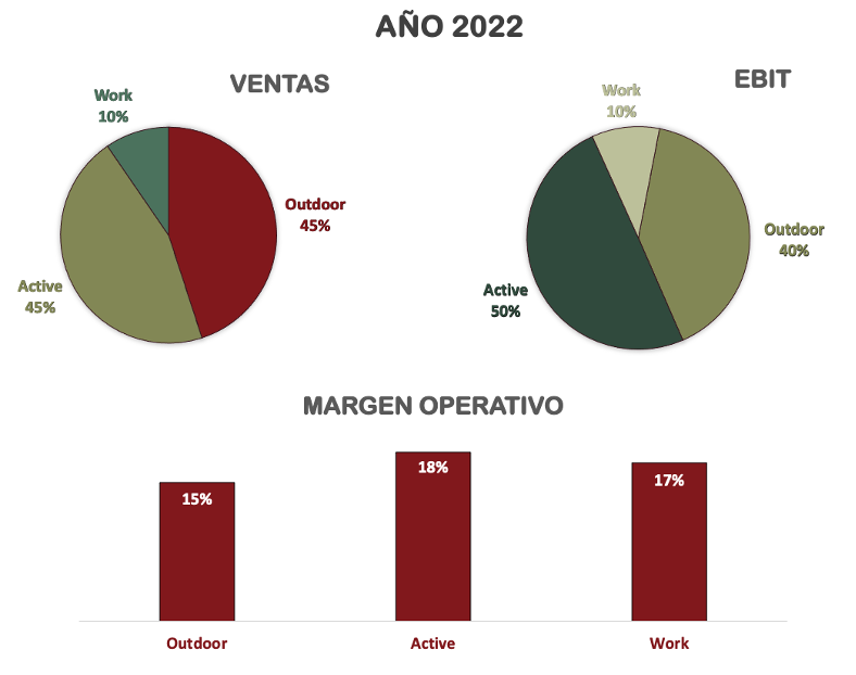 En 2022 el Margen Operativo ascendió al 14%, mientras que el Margen Neto se situó en un 12%, unos márgenes correctos y algo más altos que el resto de empresas del sector, demostrando cierto poder de fijación de precios. Si miramos los márgenes por división, el segmento Active es el más rentable, aunque todos los segmentos en general reportan buenos márgenes.