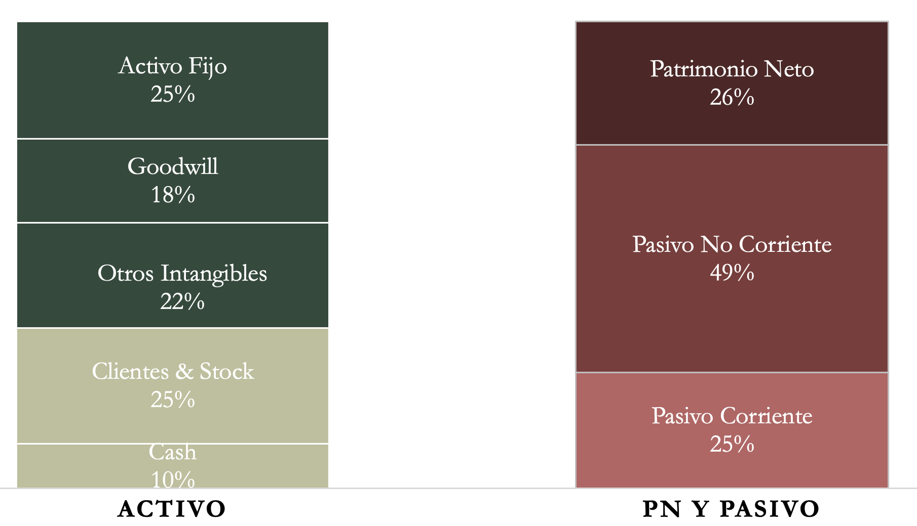 A pesar de contar con una relación de corrientes positiva, la composición del Balance parece un poco frágil: la Deuda empieza a ser considerable y los Intangibles son superiores al Patrimonio Neto.