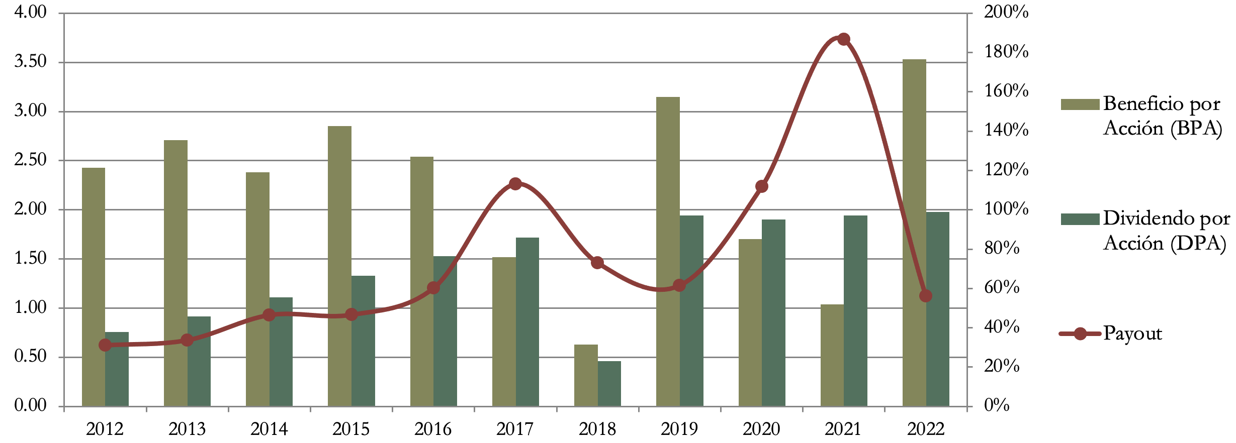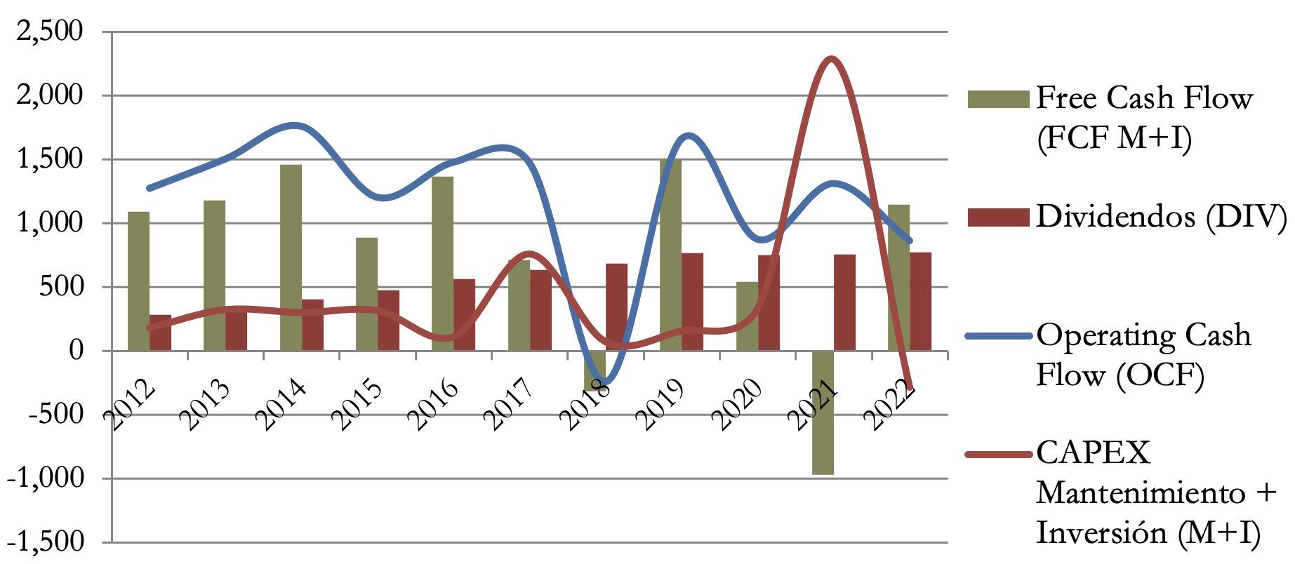 El Payout oscila mucho debido a la irregularidad de los resultados de VF, sin embargo en un año bueno como 2022 alcanzó el 56%. Un valor más alto que históricamente pero todavía sostenible y en línea con el Payout que espera tener la empresa en los próximos años.