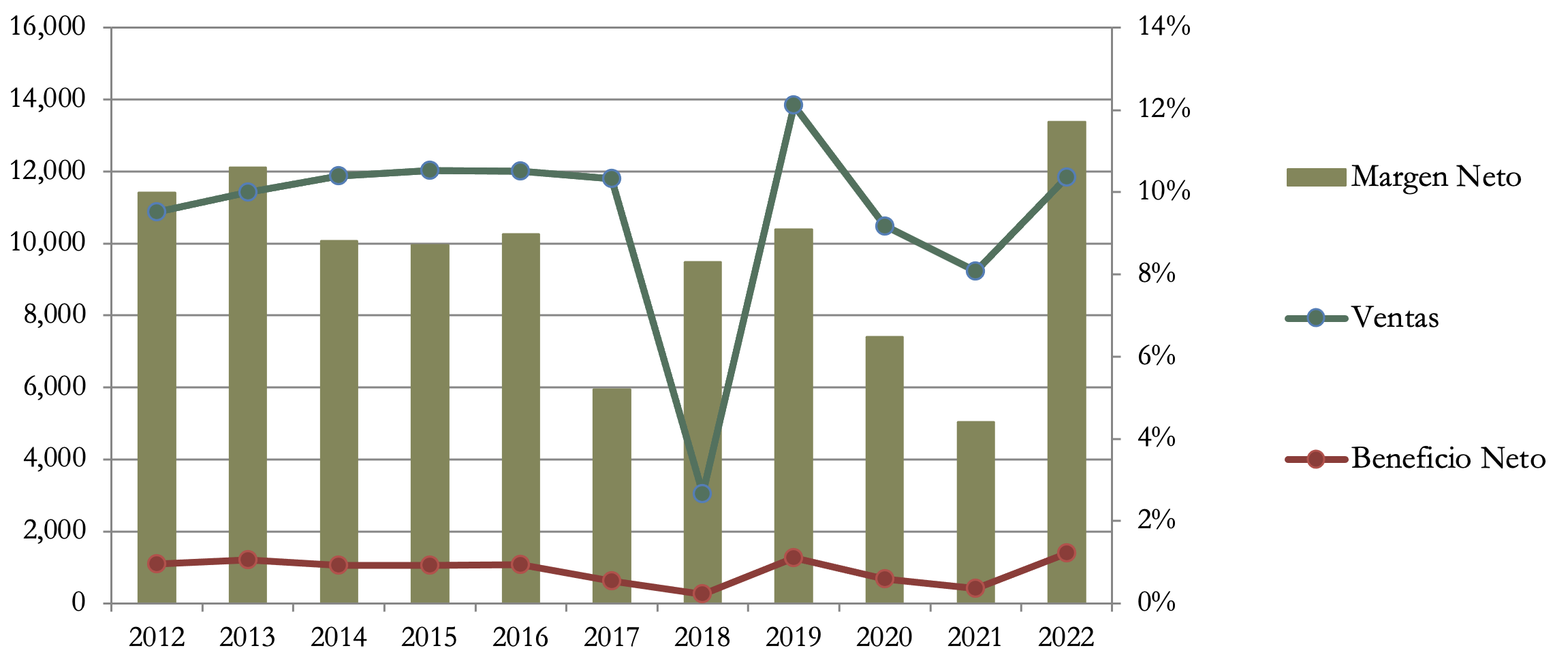 Sin embargo, dado que el Beneficio Neto oscila mucho dependiendo del año, hay que coger los datos de márgenes y ratios de rentabilidad con pinzas.