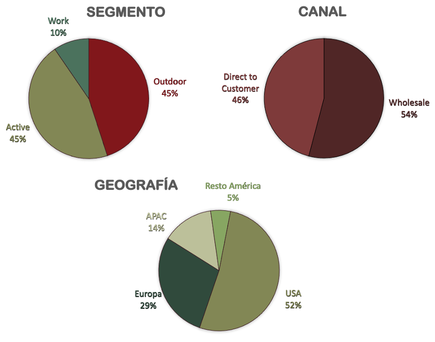 Outdoor y Active representan el 90% de la facturación. También está aumentando la venta directa en detrimento de las ventas a comercios minoristas, VF se está centrando en ofrecer un trato más personalizado a los clientes a través de las ventas digitales y sus propias tiendas. La venta de su segmento de ropa de trabajo (excluyendo Dickies y Timberland Pro) reafirma la estrategia de simplificar más el modelo operativo para centrarse en el consumidor y el comercio minorista. Geográficamente las Ventas tienen cierta dependencia a USA pero están bastante diversificadas, además las regiones que más están creciendo son APAC y EMEA.