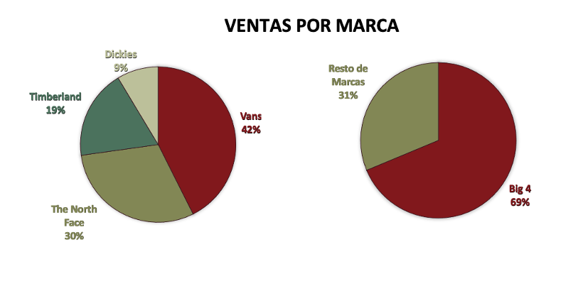 Analizando las marcas, VF detalla solamente los ingresos de Vans, The North Face, Timberland y Dickies. Las Ventas del Big 4 de marcas representan el 69% de las ventas globales de VF, peso que se ha visto algo reducido tras la compra de Supreme en 2020.