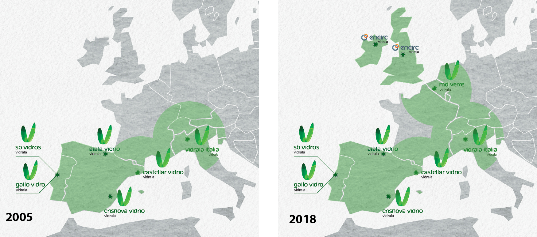 De esta forma, en 2001 se realizó la adquisición de Ricardo Gallo en Marinha Grande (Portugal), y en 2005 se adquirieron las plantas catalanas de Castellar del Vallès y las de Corsico Vetro en Italia. Continuarían las adquisiciones con la belga Manufacture du Verre S.A. en 2007, y Encirc Limited en UK e Irlanda en 2015, convirtiéndose en el 4º operador europeo en la fabricación de envases de vidrio. En 2017 también reforzó sus operaciones en Portugal adquiriendo en Marinha Grande.