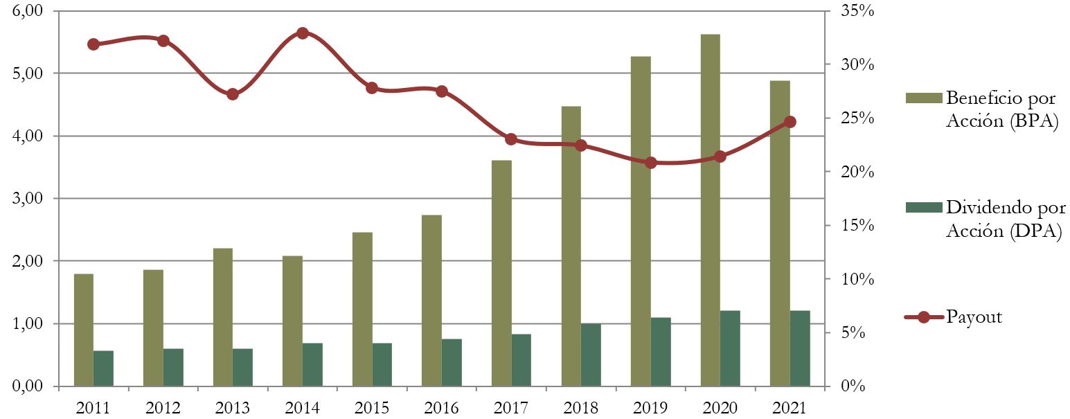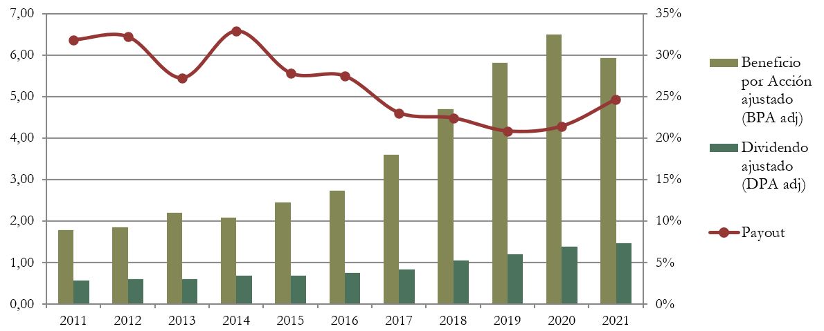 Si ajustamos el gráfico de BPA y DPA según estas ampliaciones de capital liberadas, vemos que el Dividendo es claramente creciente y su ritmo de crecimiento anual durante la última década se acerca más al 10%: