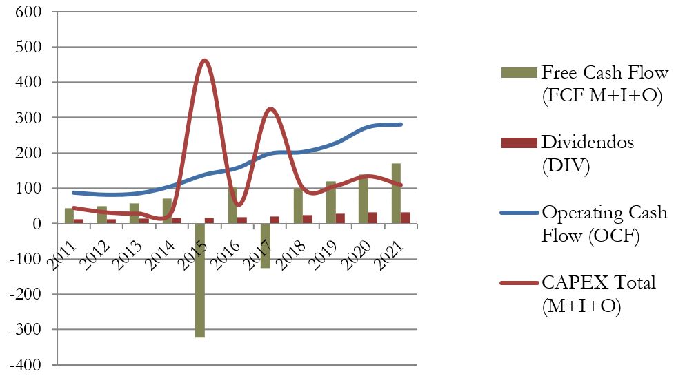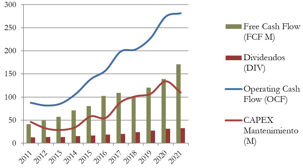Por otra parte, el CAPEX de Mantenimiento también crece, pero a un ritmo menor que el OCF, lo cual provoca un saludable Free Cash Flow creciente. Además, los Dividendos repartidos representan una fracción de dicho FCF (entre el 20% y el 25%), y por tanto es evidente que tanto el Dividendo como su crecimiento son perfectamente sostenibles.